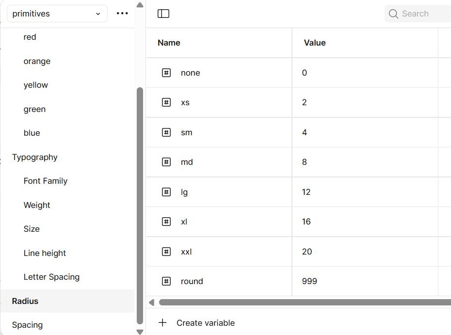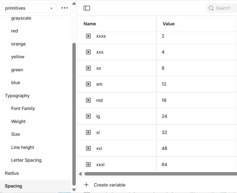 For spacing, I created a scale of variables in the primitives collection, ranging from very tight (xxxs = 2px) to very generous (xxxl = 64px). The steps are based on the familiar 4px / 8px increments, because those are both flexible and easy to remember.