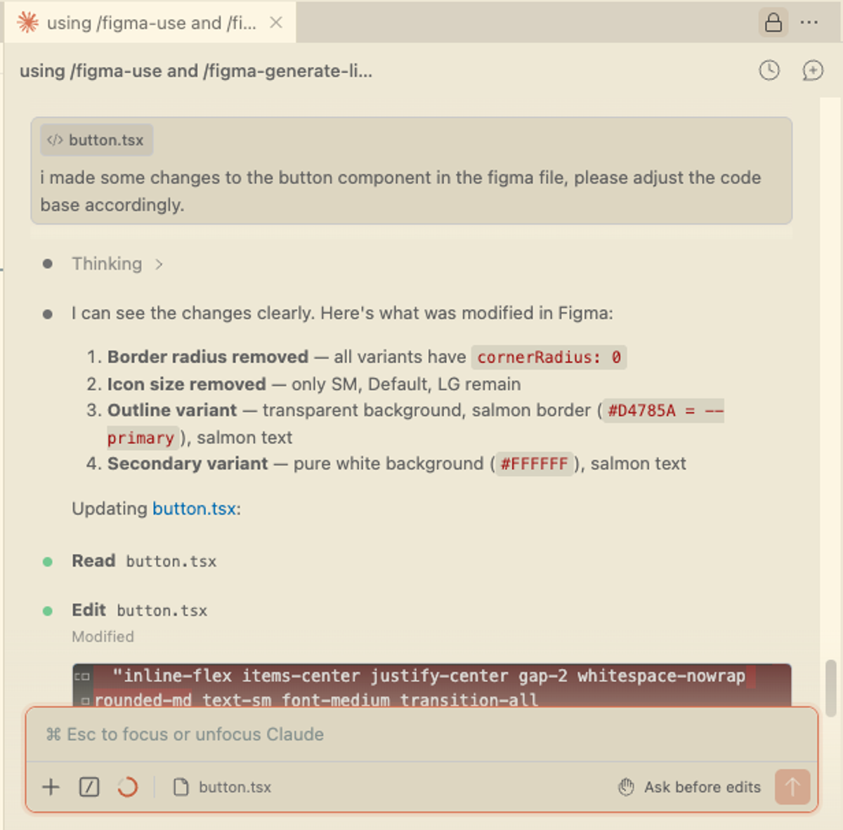 So I went ahead and fixed it. Removed the rounded corners, adjusted the background color of the secondary button by updating a variable directly in Figma. Then I went back to the agent and asked it to detect the changes I had made and update the codebase accordingly. It came back with a clear list of exactly what it had found and changed.