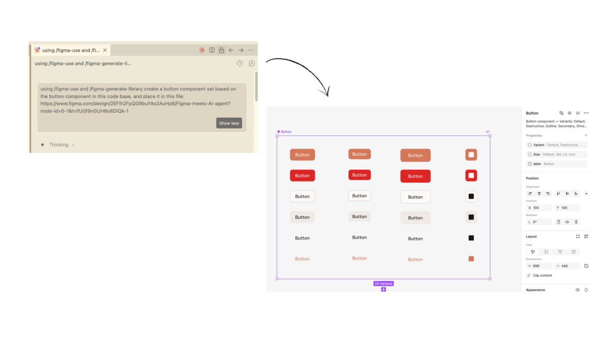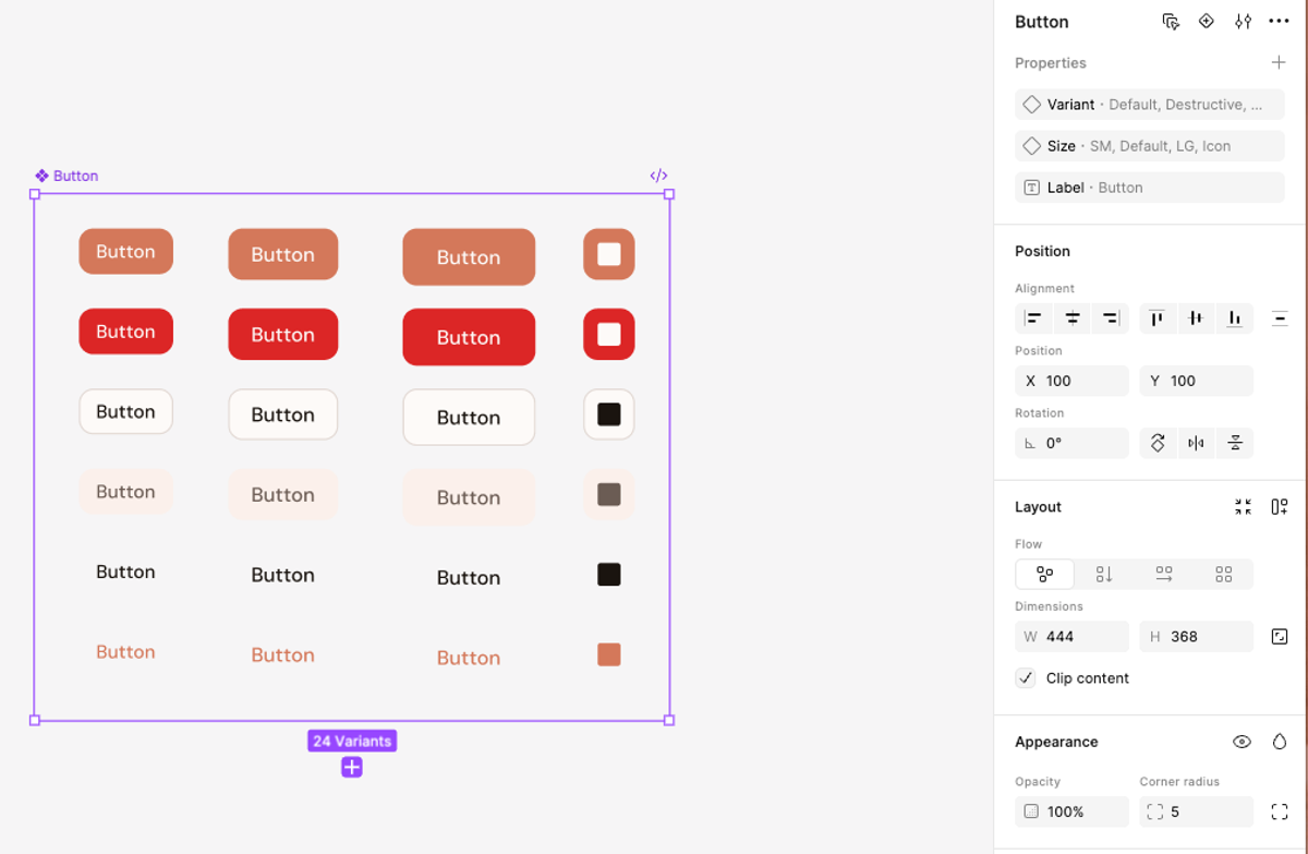 What came back was actually pretty good. Twenty four variants, proper component properties set up in the panel, variant and size toggles working correctly. It also created a Figma variable library from my color tokens with the correct hex values. That part genuinely impressed me. It did not just draw buttons in the right color, it set up the system properly.