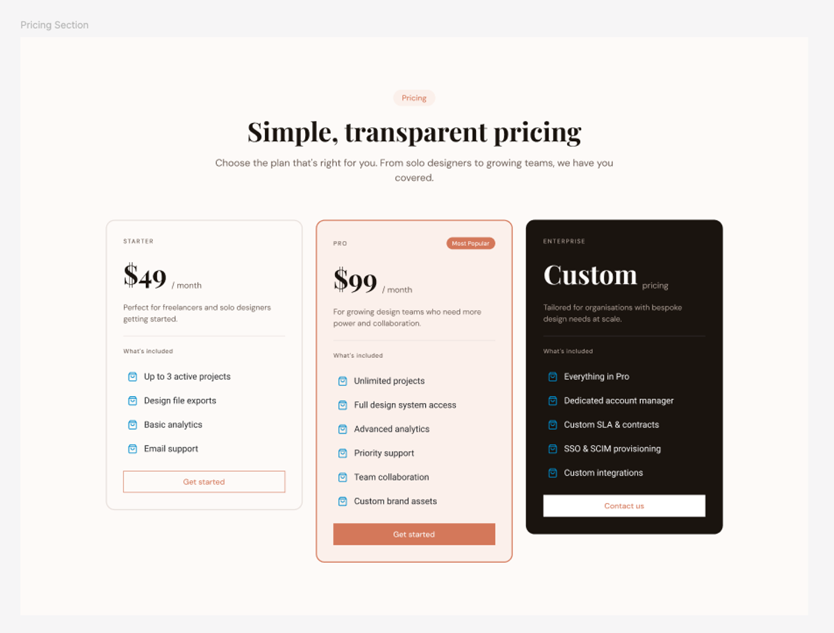 I asked Claude to create a pricing section in Figma. I did not give it any content direction: no copy, no pricing numbers, nothing specific. I wanted to see what it would do with just the system and a brief. The prompt I used was: