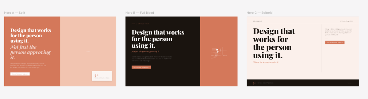 Three directions came back. A split layout (actually looked like my current one), a full bleed dark version and an editorial layout with an asymmetric grid. All three used the correct colors, the right typography mix, the actual components from the system. Not generic output, but directions that genuinely felt like they belonged to the same brand.