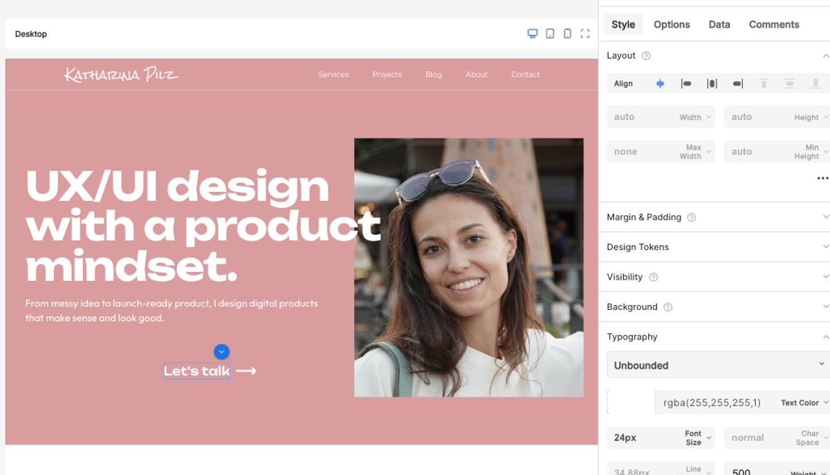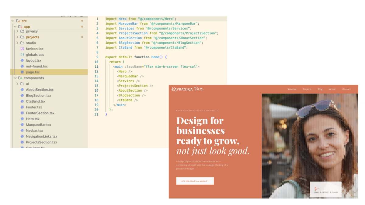 The setup was simple: a Next.js shell in code for the structure (navigation, footer) and Builder.io handling everything in the middle. I designed the site in Figma and brought it into Builder.io, which was straightforward with the plugin. Pages, blog posts, project pages. I could update content, publish new posts, and make layout changes without touching the codebase.